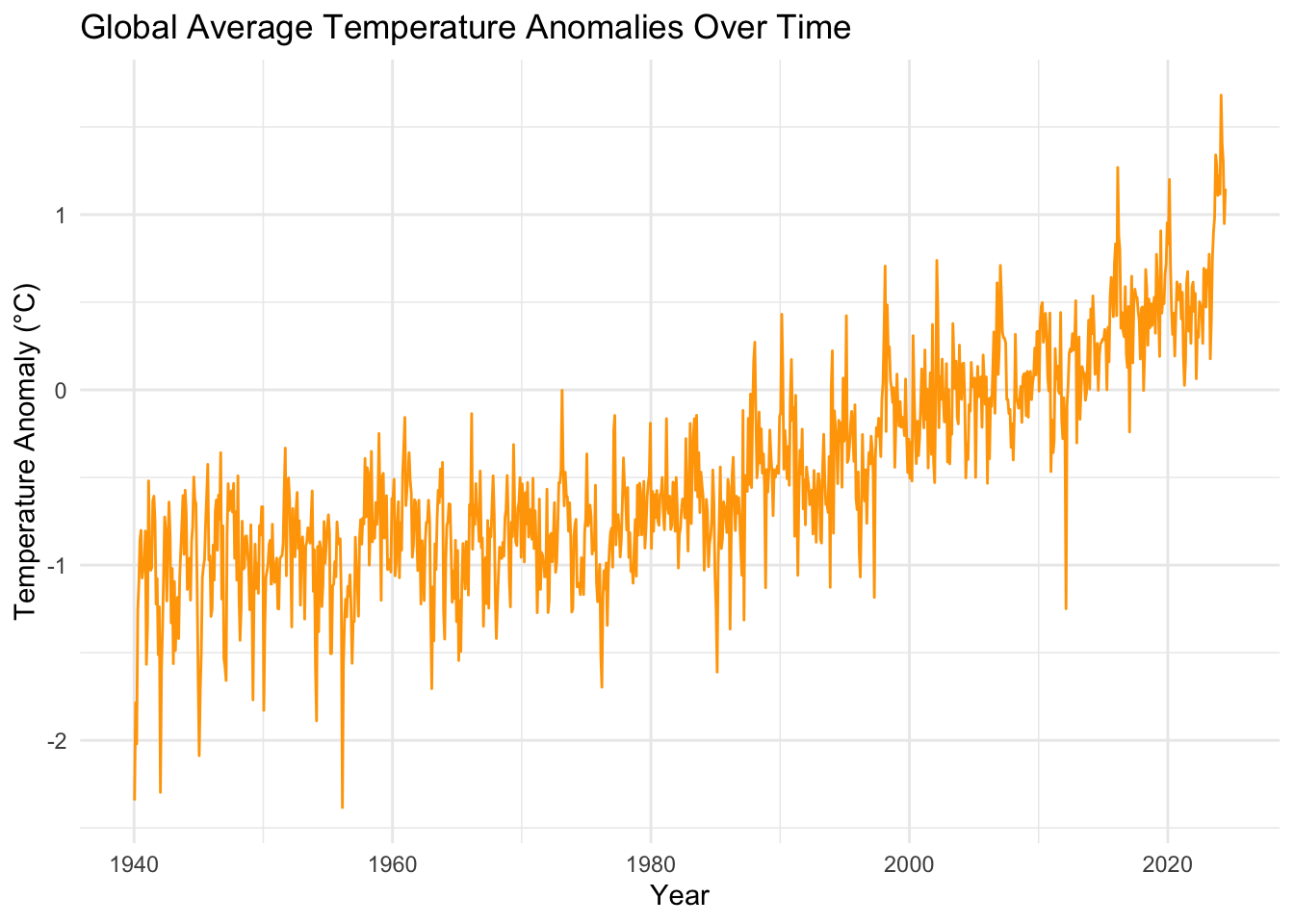 This visualization shows the average temperature anomalies across the globe from 1940 to the present. Each point represents the deviation from the long-term average temperature for a given month. The trend line highlights the overall warming pattern, illustrating the increase in temperature anomalies over the decades.